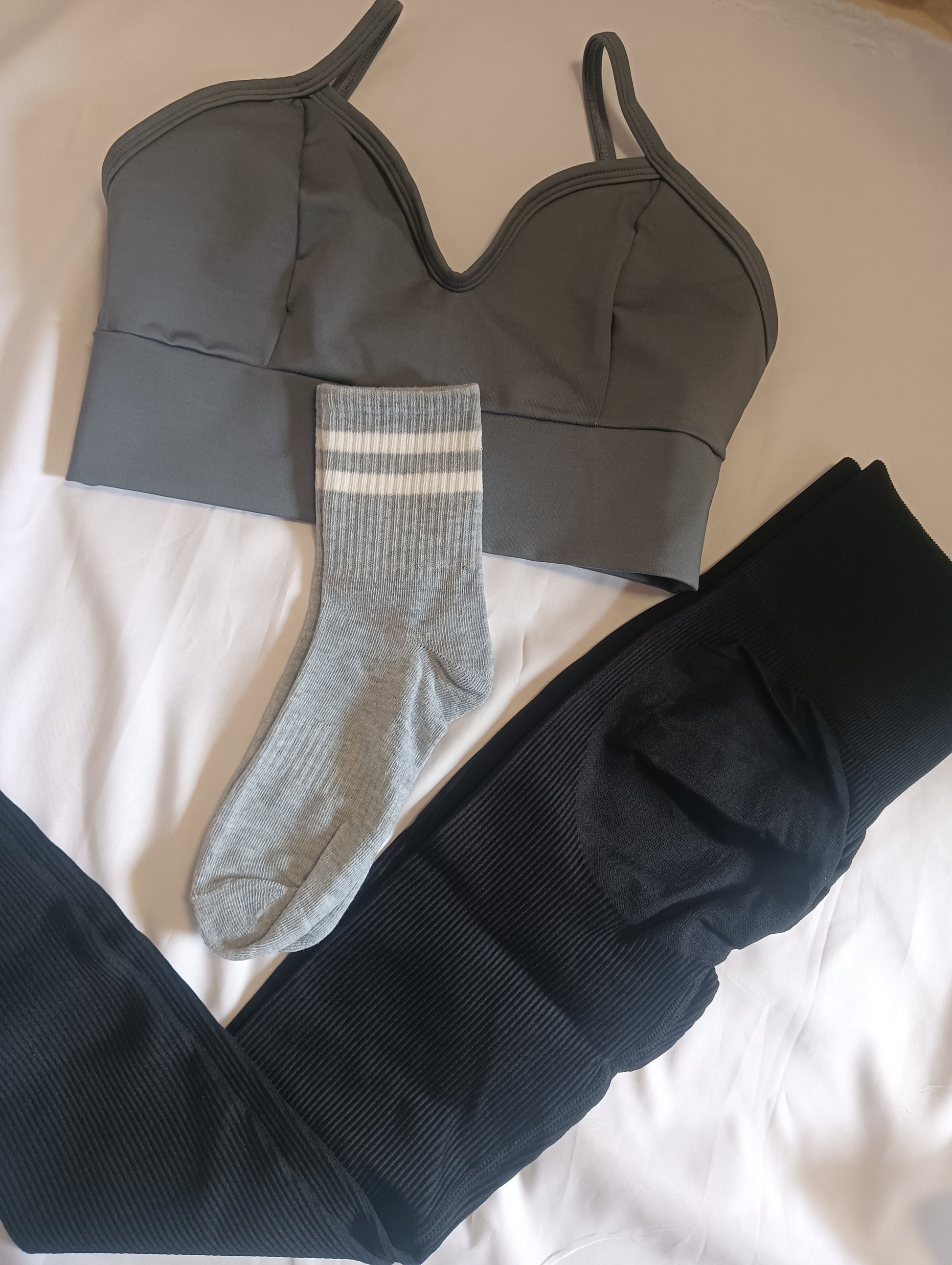 Su tejido elástico se adapta naturalmente a tu figura, brindando soporte, comodidad y confianza tanto en el entrenamiento como en el día a día. El set se completa con medias deportivas grises, creando un look deportivo moderno y versátil.